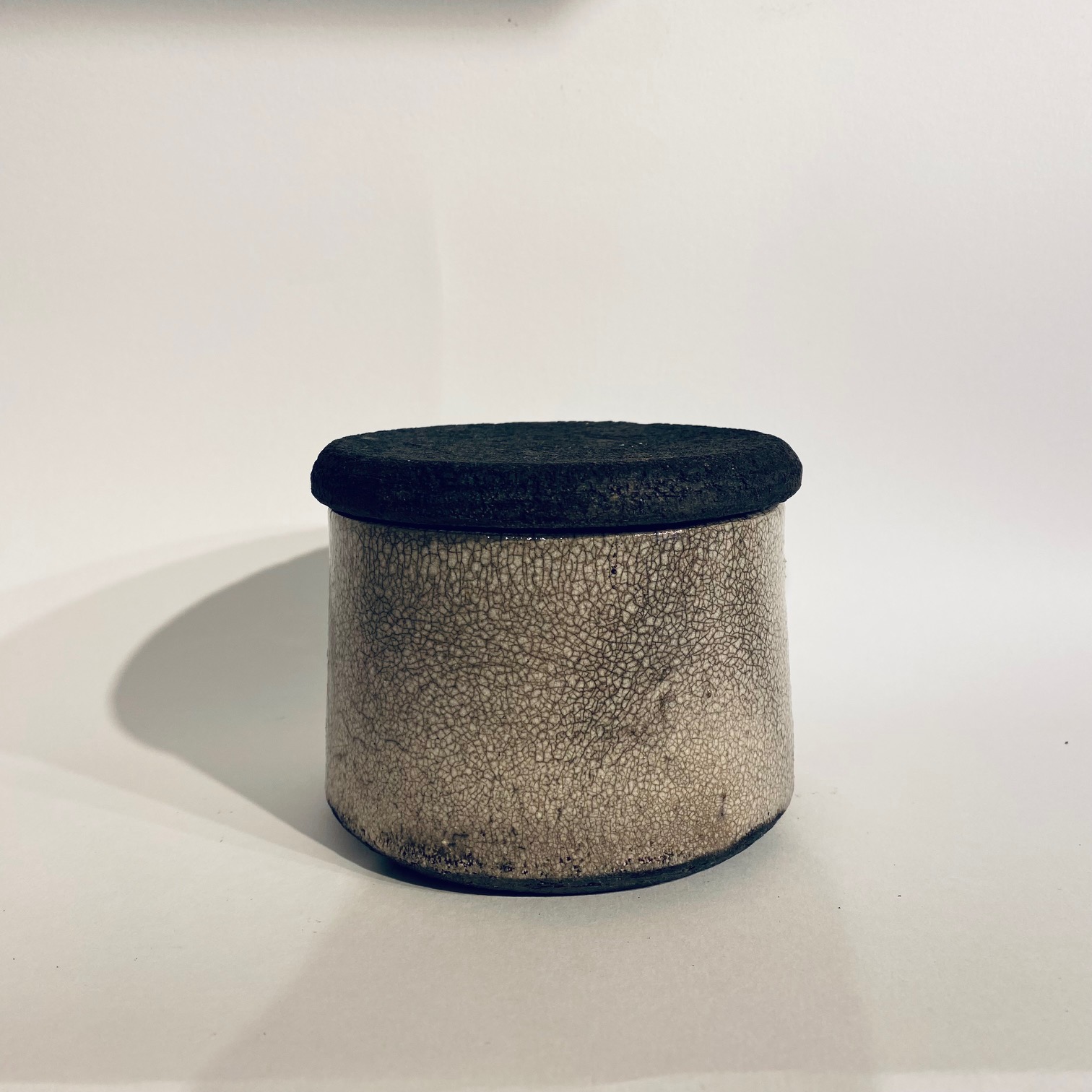 Hand thrown and raku fired ceramic tumbler with lid. Some are partially glazed and left raw on inside & the bottom.
